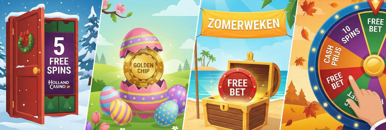 De eerste en leukste manier om bij Holland Casino iets gratis te krijgen, is via hun seizoensgebonden acties. Denk hierbij aan de December Kalender, Paas-acties of speciale Zomerweken.