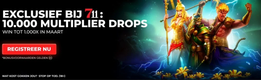 Van 3 maart tot 31 maart deelt 711 multiplier drops uit op Pragmatic Play slots. Je kunt een drop raken van 10x tot zelfs 1000x je inzet terwijl je gewoon je favoriete slots speelt. De prijs wordt daarna bijgeschreven op je account.
