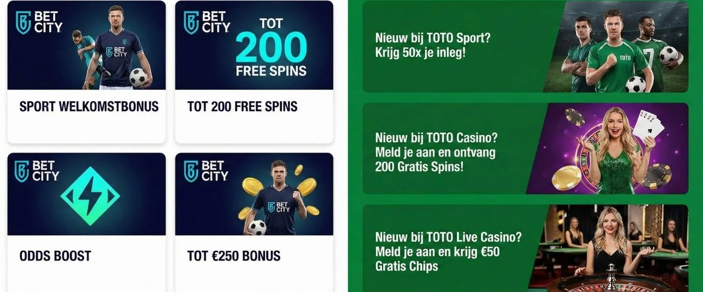Ronde 1 tussen Betcity en TOTO zijn de welkomstbonussen en voorwaarden. Beide casino’s scoren zeer goed op welkomstbonussen dus dit wordt een spannende strijd. Beide caisno’s hebben meerdere welkomstbonussen beschikbaar voor casino en sports, de volgende springen er bij beide bovenuit: