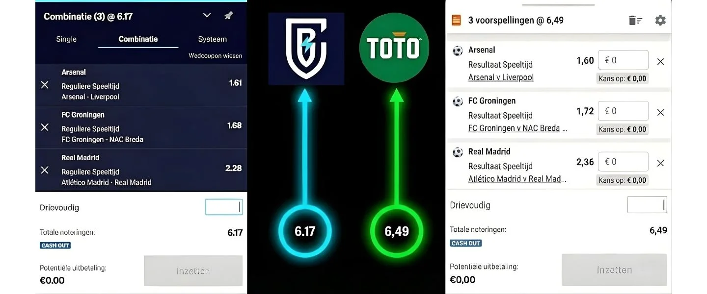 Om de odds van de bookmakers eerlijk te vergelijken, hebben we een combinatieweddenschap samengesteld met drie willekeurige wedstrijden. Uit deze steekproef blijkt dat TOTO aanzienlijk hogere quoteringen aanbiedt dan BetCity. Waar je bij BetCity blijft steken op een odd van 6.17, pak je bij TOTO een totale odd van 6.49.