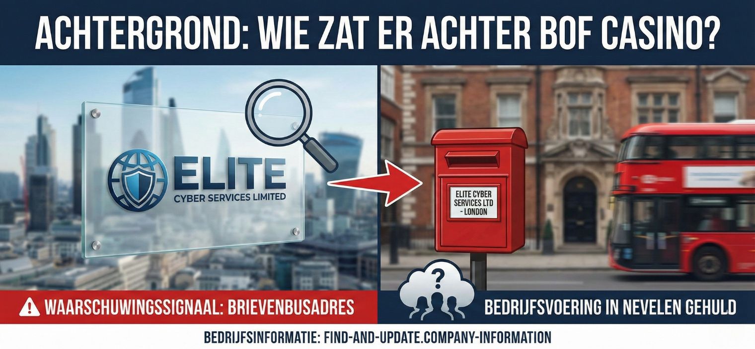 Het bedrijf dat verantwoordelijk was voor de exploitatie van BOF Casino is Elite Cyber Services Limited. Dit klinkt wellicht indrukwekkend maar bij nader onderzoek bleek dit bedrijf geregistreerd te staan op een simpel brievenbusadres in Londen.