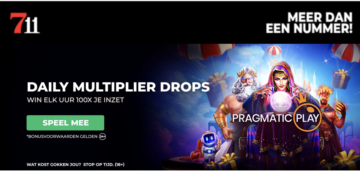 Vanaf 2 oktober tot en met 31 oktober doet 711 er een schepje bovenop met de zogenaamde Multiplier Drops. Elke dag worden er gemiddeld 30 multipliers uitgedeeld (in totaal 720 in de maand). Je hoeft je niet aan te melden, alleen maar te spelen op Pragmatic Play slots. Dat mag zo goedkoop of duur als je zelf wilt, want er is geen minimuminzet.