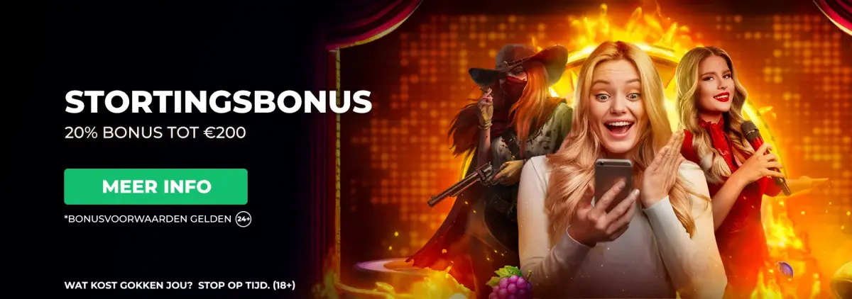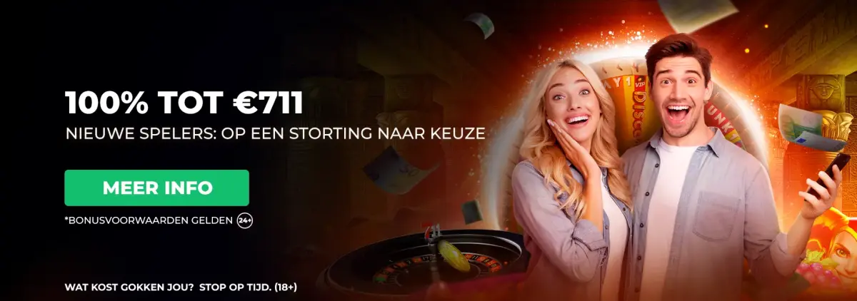 Bonussen en promoties zijn alleen beschikbaar voor 24+. De leeftijd dient naar waarheid te worden ingevuld. Door je leeftijd aan te geven stem je ook in met onze algemene voorwaarden en cookiebeleid. Bij het betreden van de website bevestig je ook dat je niet bent uitgesloten van deelname aan kansspelen.